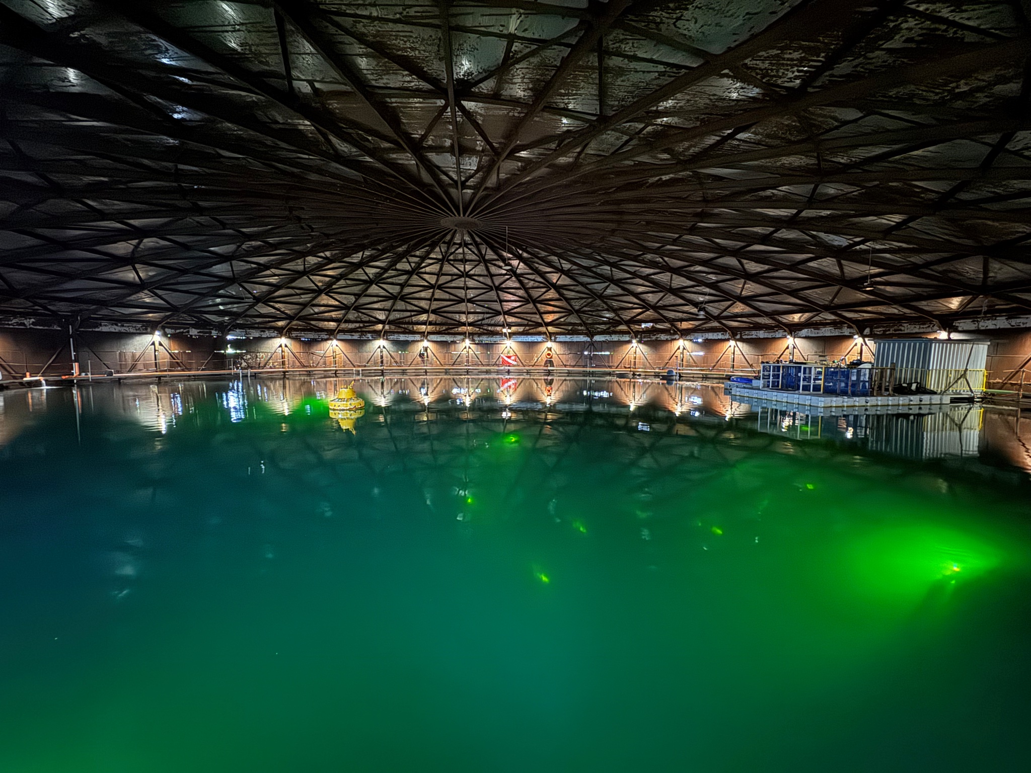 Wie unser Logo zeigt, ist die Geschichte des Vereins eng mit dem Gasometer im Landschaftspark Duisburg-Nord verbunden. Was im November 1991 mit der Erkundung einiger Tauchverrückter begann, entwickelte sich über die Jahre zum größten Indoor-Tauchbecken Europas: 21 Millionen Liter Wasser, 45 Meter Durchmesser, 13 Meter Tauchtiefe. In harter Arbeit und mit vielen Stunden Freizeit der Vereinsmitglieder wurde der Gasometer – unterstützt von lokalen Sponsoren – restauriert und als Tauchgewässer erschlossen. Es wurde entrostet, geschweißt, der Glockendeckel angehoben und fixiert, eine Unterwasserbeleuchtung installiert, der Boden mit Kies bedeckt, die Fläche mit einem Wrack, einem künstlichen Riff, einem archäologischen Feld, zwei Autos und sogar einem kleinen Flugzeug ausgestattet sowie ein Treppenturm und ein Lastenaufzug installiert. Konstant gute Sicht, Übungsplattformen in unterschiedlichen Tiefen und viele spannende Objekte machen den Gasometer heute zu einem idealen Ganzjahrestauchgewässer für Anfänger und Fortgeschrittene. Die Temperaturen schwanken – abhängig von der Jahreszeit – zwischen ca. 7 °C im Winter und bis zu 26 °C im Sommer. Die Gewährleistung einer guten Wasserqualität, die Wartung des Lastenaufzugs, der Einstiege sowie der umfangreichen Über- und Unterwasserbeleuchtung werden mittlerweile durch Christian Patzak und sein kommerzielles Unternehmen TauchRevierGasometer sichergestellt. Auf seiner Homepage findest du auch immer die aktuellen Wassertemperaturen im Gasometer. Die Mitglieder der Taucher im Nordpark Duisburg e. V. haben nach wie vor das Recht, in Absprache mit dem Betreiber den Gasometer als Vereinsgewässer unentgeltlich zu nutzen – Tag und Nacht.