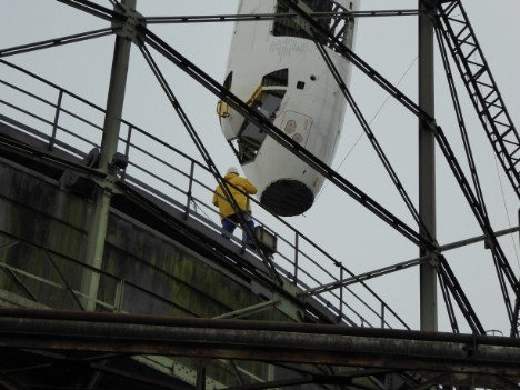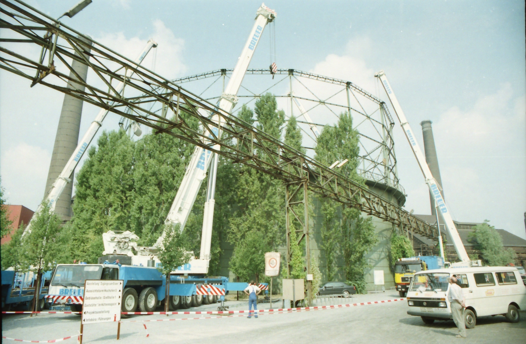 August 1997: Der Glockendeckel (260 Tonnen) wird mithilfe von fünf Autokränen angehoben und 3,50 m über dem zukünftigen Wasserspiegel verankert.
