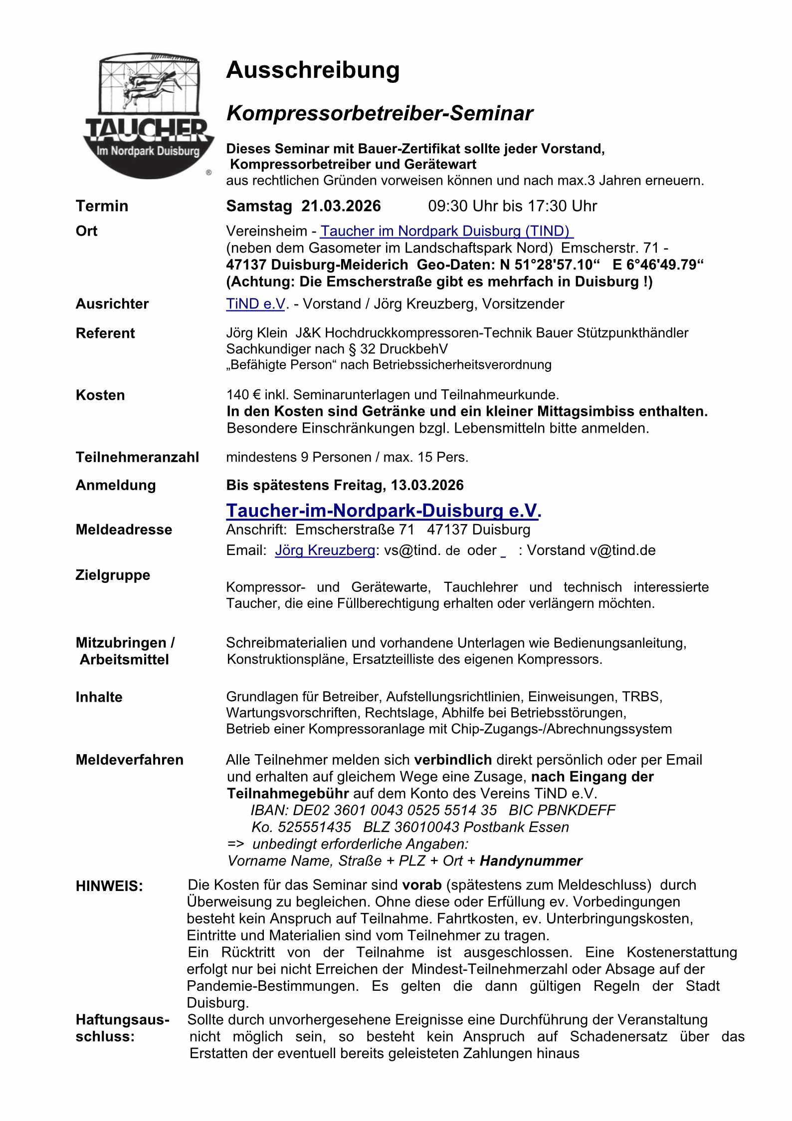 Das Seminar richtet sich an interessierte Taucher/innen, Gerätewarte und Ausbilder und findet jährlich Ende Februar/Anfang März statt.